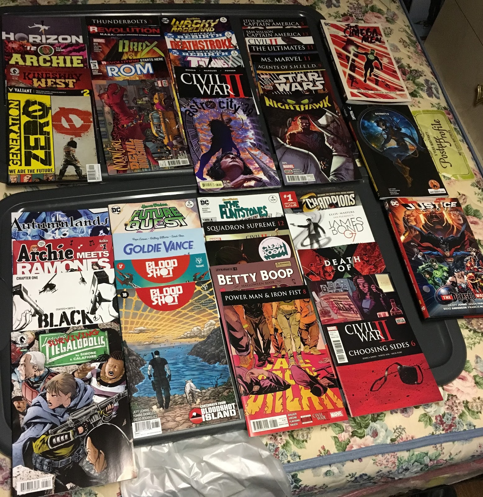 I got Bloodshot Reborn 17 & 18 by Jeff Lemire, Mico Suayan, Tomas Giorello, Diego Rodriguez & David Baron, capping off the Bloodshot Island Saga and starting up the new Bloodshot USA angle. Questions abound; Histories for each of the Bloodshots; Is Deathmate truly Kay? And Bloodhound being Bloodhound are ALL in play. Glorious, GLORIOUS chaos!